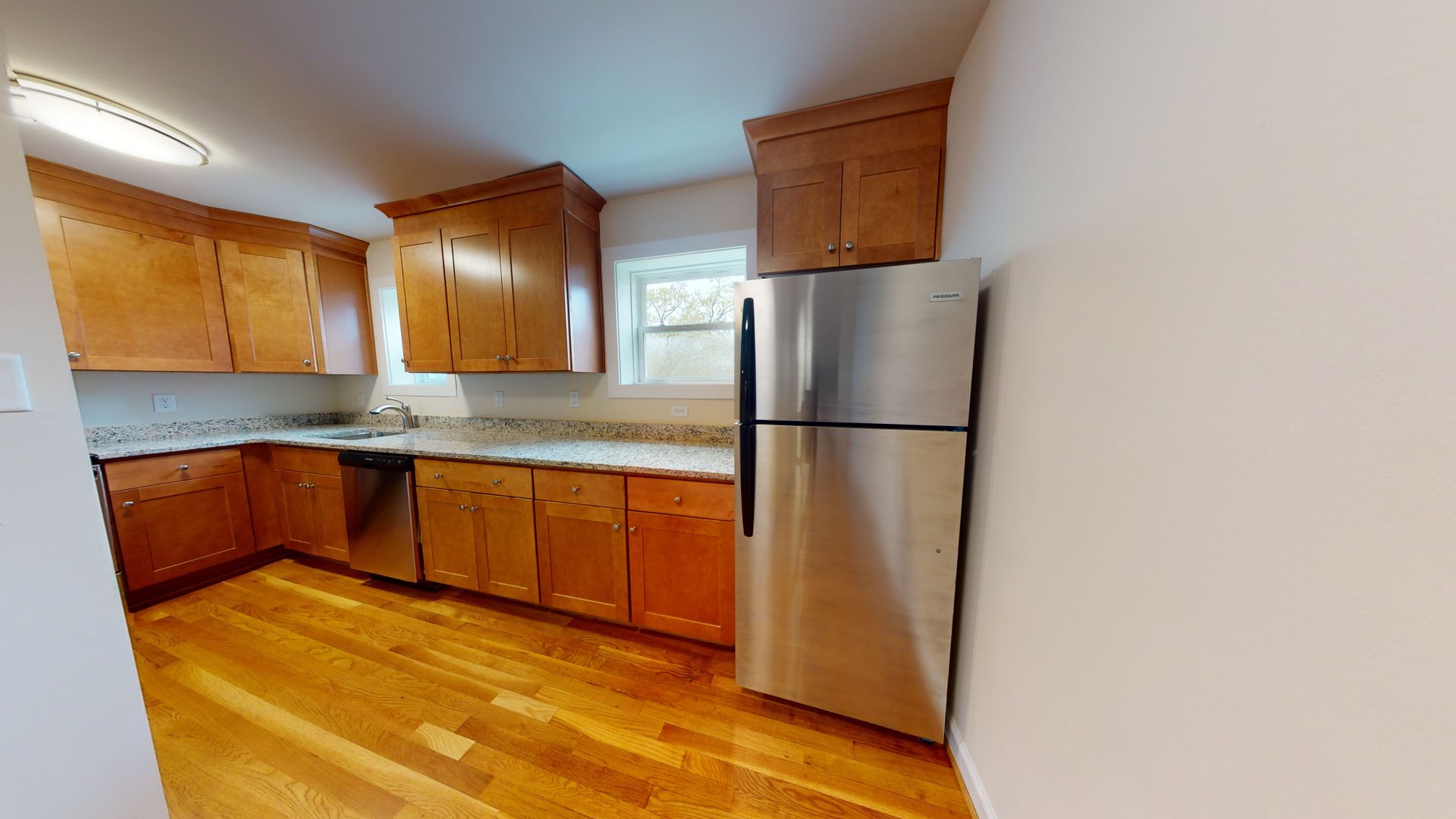 This two bedroom apartment has everything you want and need. Brand new kitchen with granite counter tops and all new stainless steel appliances, refrigerator, stove, microwave, and dishwasher. Hardwood floors throughout, central heat and air conditioning, and a stackable washer/dryer in the apartment.